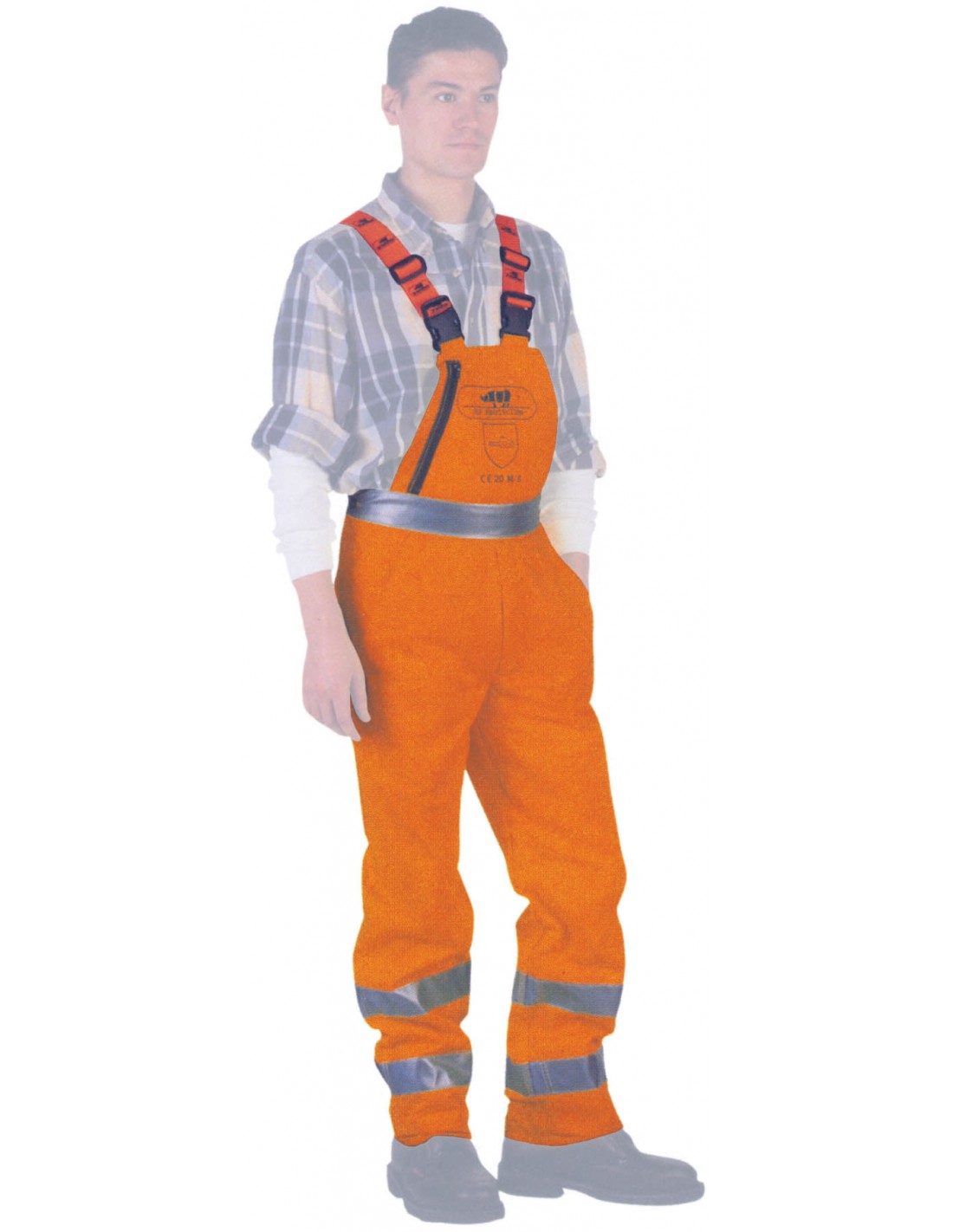 EN471 std. classe 2-2, 3 bande riflettenti da mm. 70, costruzione esterna 85% poliestere, 15% cotone, 270 gr/m2, protezione interna in kevlar miscelato poliammide HT, classe protettiva 1 tipo A, dotato di due tasche anteriori, una posteriore, portametro laterale, colore arancio.