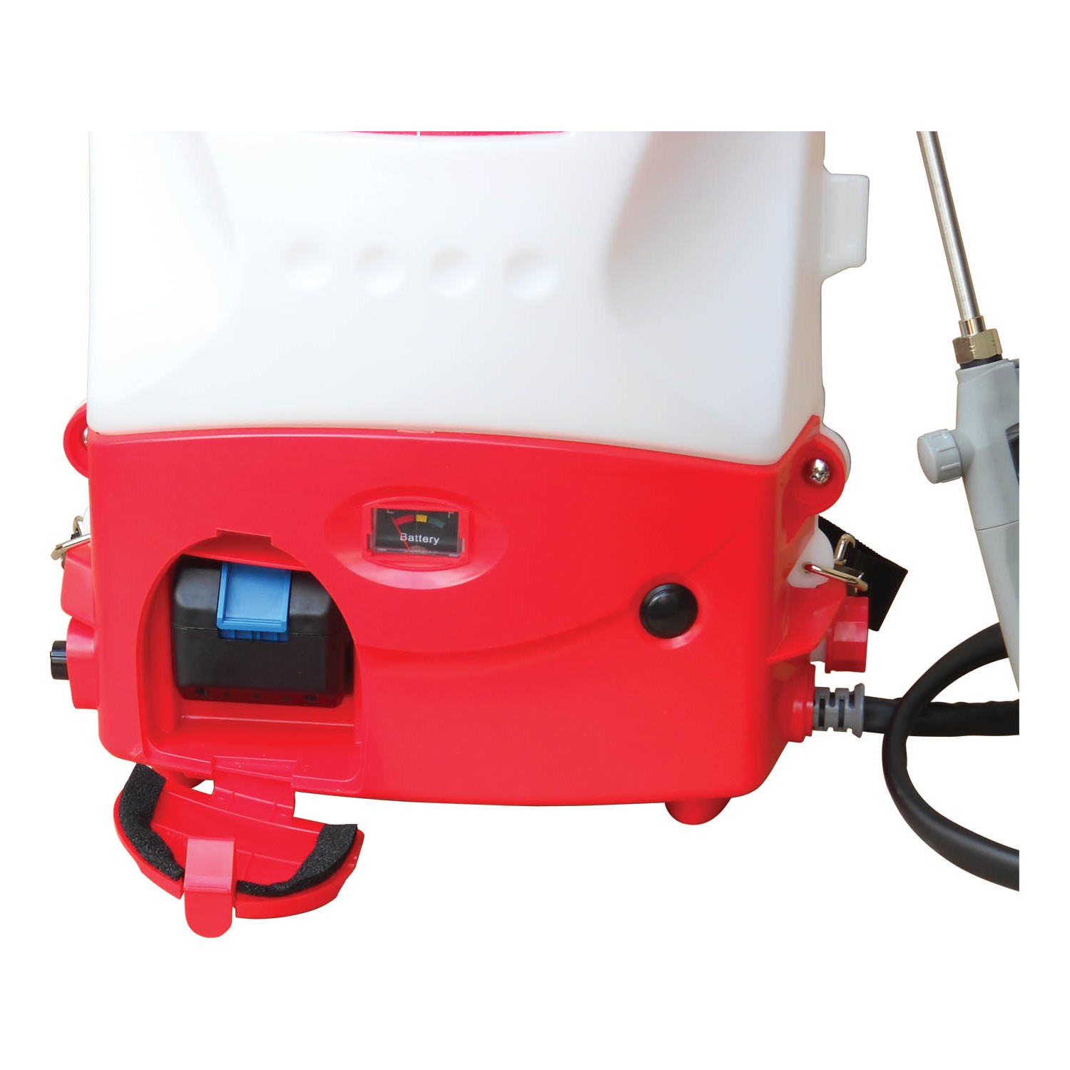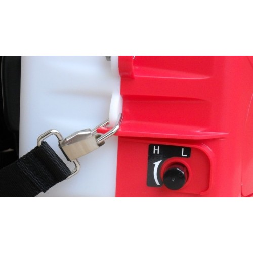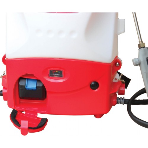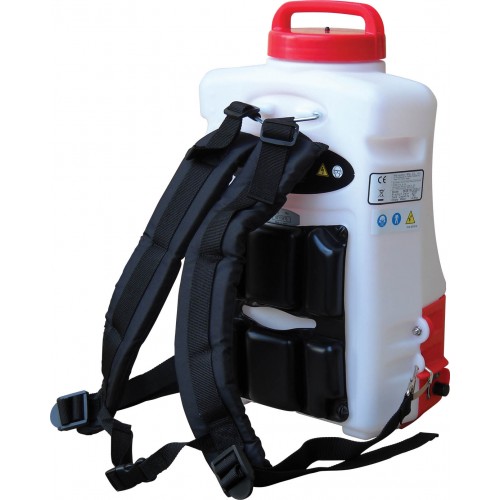 Pompa a pistoni pressione da bar 0,5 a 10,0, serbatoio litri 15, mandata l/min. 1,3, lancia con doppio ugello, dimensione gocce ?m 100-120 in funzione dell'ugello montato, batteria Litio V. 18 Ah 4, autonomia minuti 75 (300) alta (bassa) pressione, tempo di ricarica h. 4, fornito con spallaccio, rumorosita' dB(LwAg) 82, dimensioni mm. 235x365x550h, peso Kg. 4,6