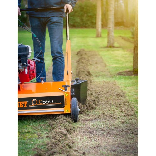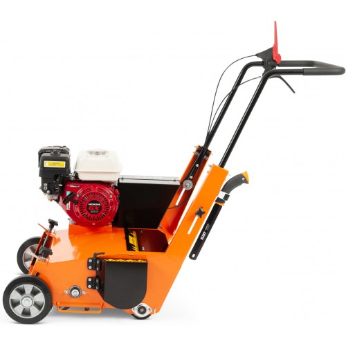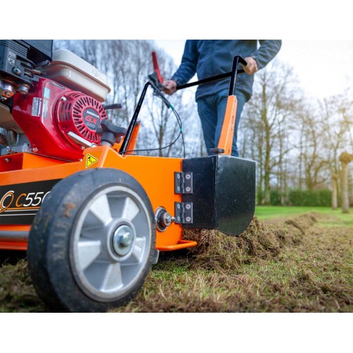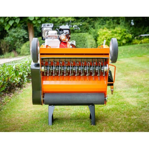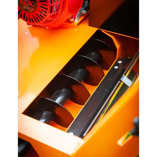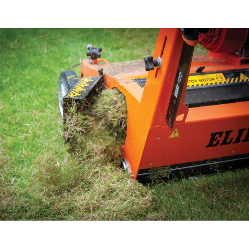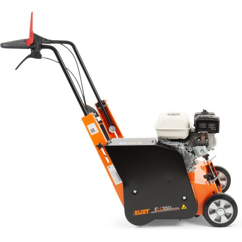 Larghezza di lavoro mm. 550, 66 lame fisse doppie da mm. 1,5 con mm. 15 interasse a rotazione opposta al senso di marcia, trasmissione a cinghia, frizione a cinghia, velocita' avanzamento Km/h 2,5, ruote anteriori in alluminio su doppi cuscinetti, rullo di trazione posteriore Ø mm. 100, , rumorosita' dB(A) 98, coclea espulsione laterale del materiale di risulta Ø mm. 150.
