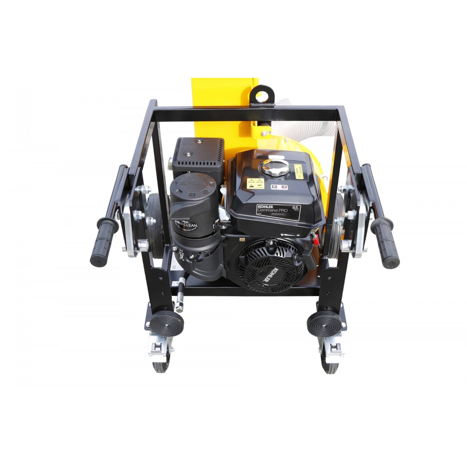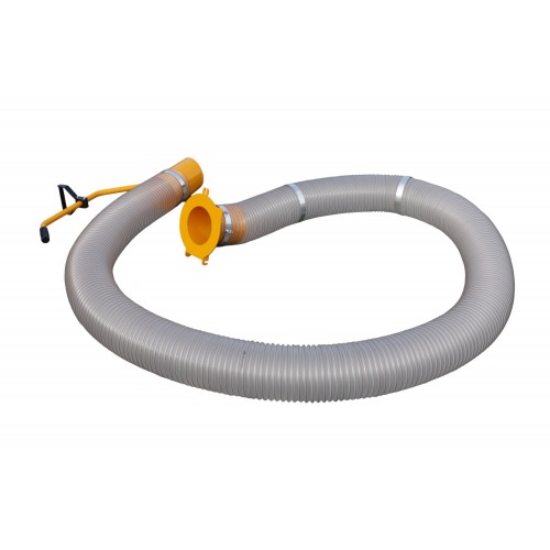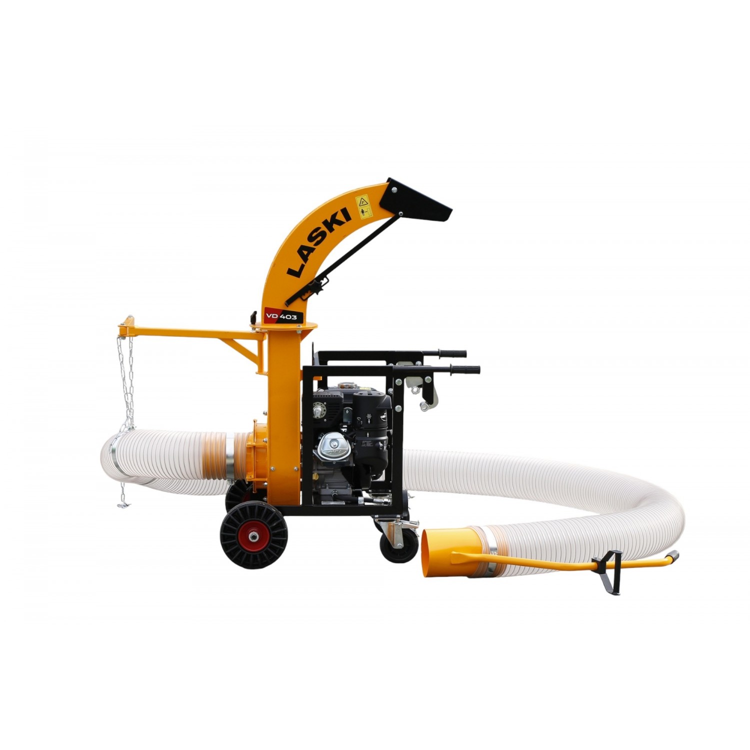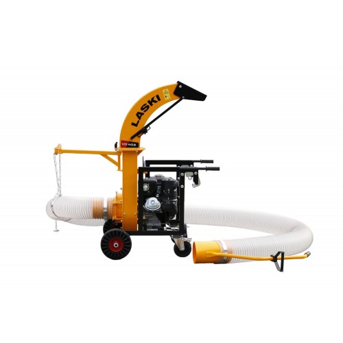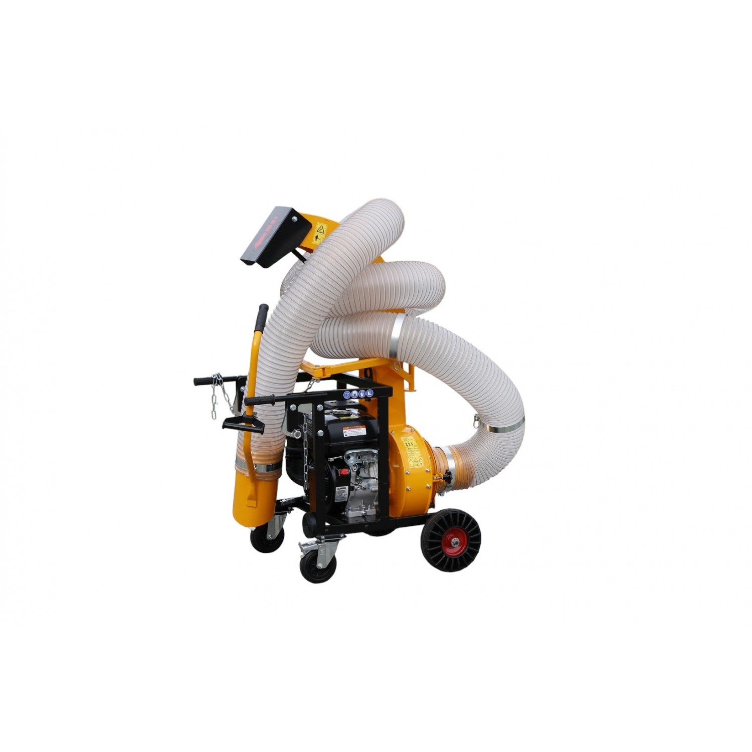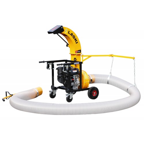 Trasmissione alla turbina diretta, volume aria m3/min. 95, chiocciola Ø mm. 340, turbina Ø mm. 300 a 4 pale in acciaio da mm. 5, bocca aspirazione Ø mm. 180 in acciaio, avviamento a strappo, occhione di aggancio per il sollevamento posto a mm. 750 da terra, stegole di manovra ergonomiche, telaio acciaio mm. 3, completo di tubo da m. 6, camino di scarico girevole con deflettore regolabile, rumorosita' dB(LwA) 111, due ruote anteriori 3.00x4 e due ruotini piroettanti con freno, completo di sistema di aggancio alla sponda del mezzo con tamponi e pomoli di fissaggio, dimensioni 970x760x1435h, peso senza tubo Kg. 110, peso totale Kg. 131