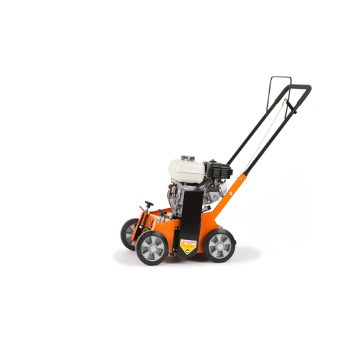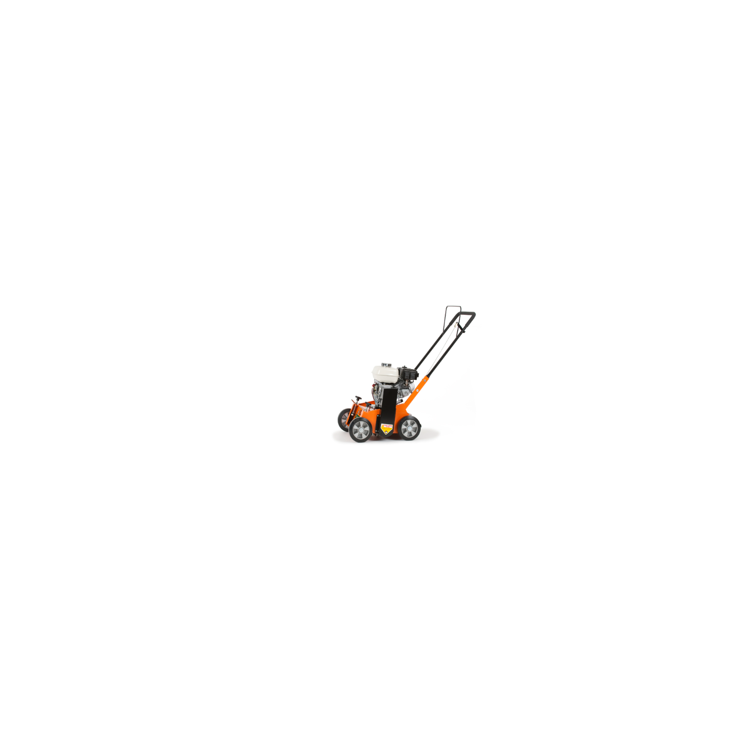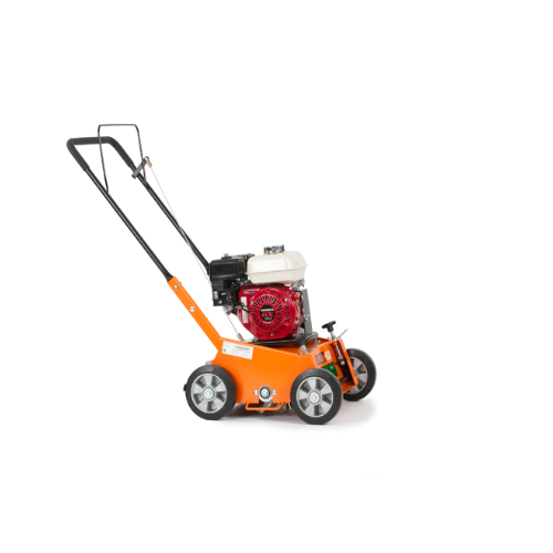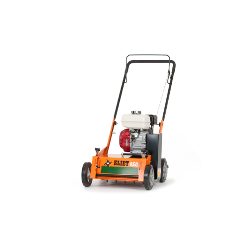 Larghezza di lavoro mm. 450, 16 lame fisse da mm. 2,5, trasmissione a cinghia, frizione a cinghia, ruote in alluminio su doppi cuscinetti, senza cesto di raccolta.
