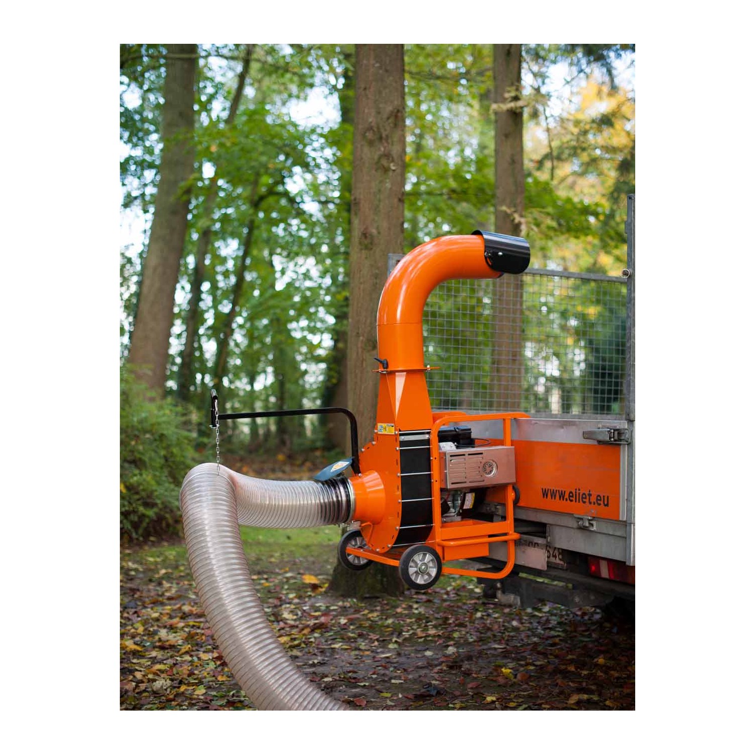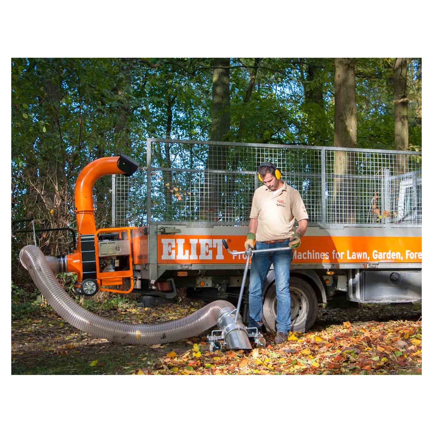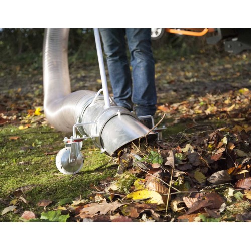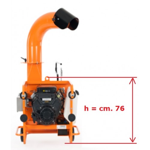 Motore B&S Vanguard bicilindrico 23HP avviamento elettrico.Trasmissione alla turbina diretta, volume massimo aria m3/h. 108, velocita' aria km/h 260, chiocciola Ø mm. 450, turbina Ø mm. 380, bocca aspirazione Ø mm. 200 in acciaio con ruotino piroettante di supporto, stegole di manovra ergonomiche, telaio acciaio mm. 3, completo di tubo da m. 3,5, regolazione deflettore di scarico manuale, camino rotante a 360°, rumorosita' dB(LwA) 112.