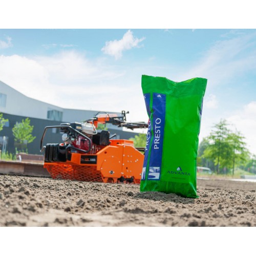 Trazione idrostatica sui due rulli anteriori e posteriore, due erpici oscillanti spianano il terreno e interrano i semi