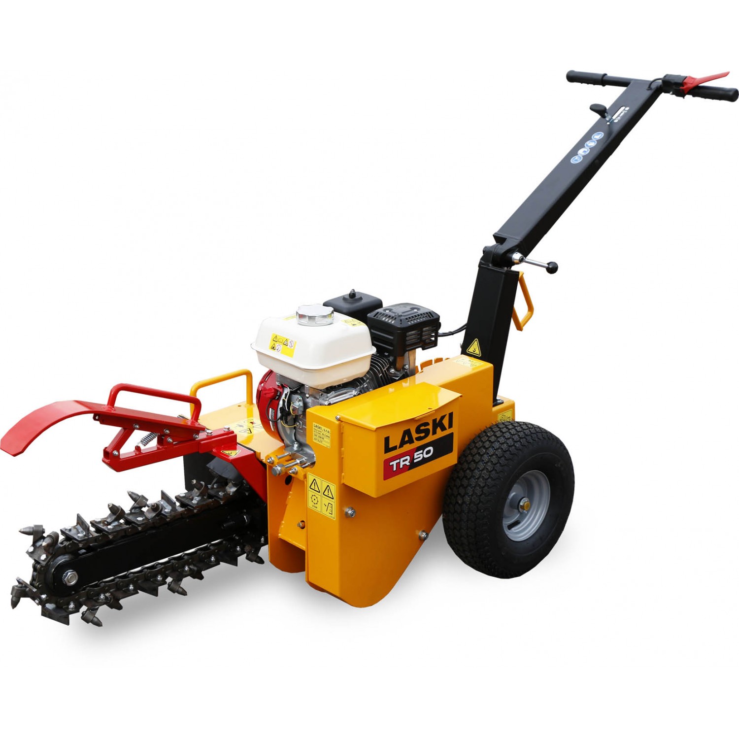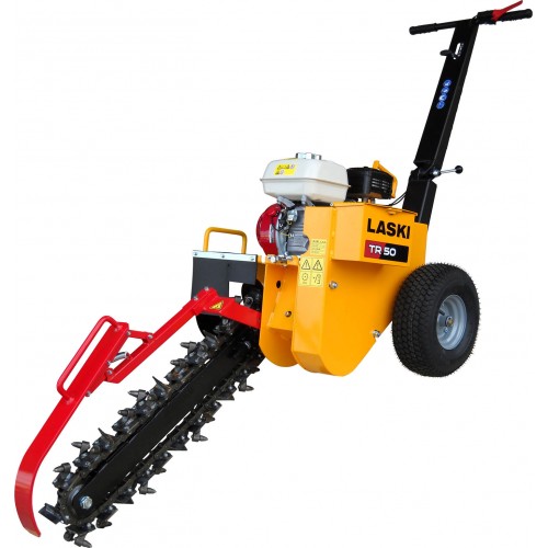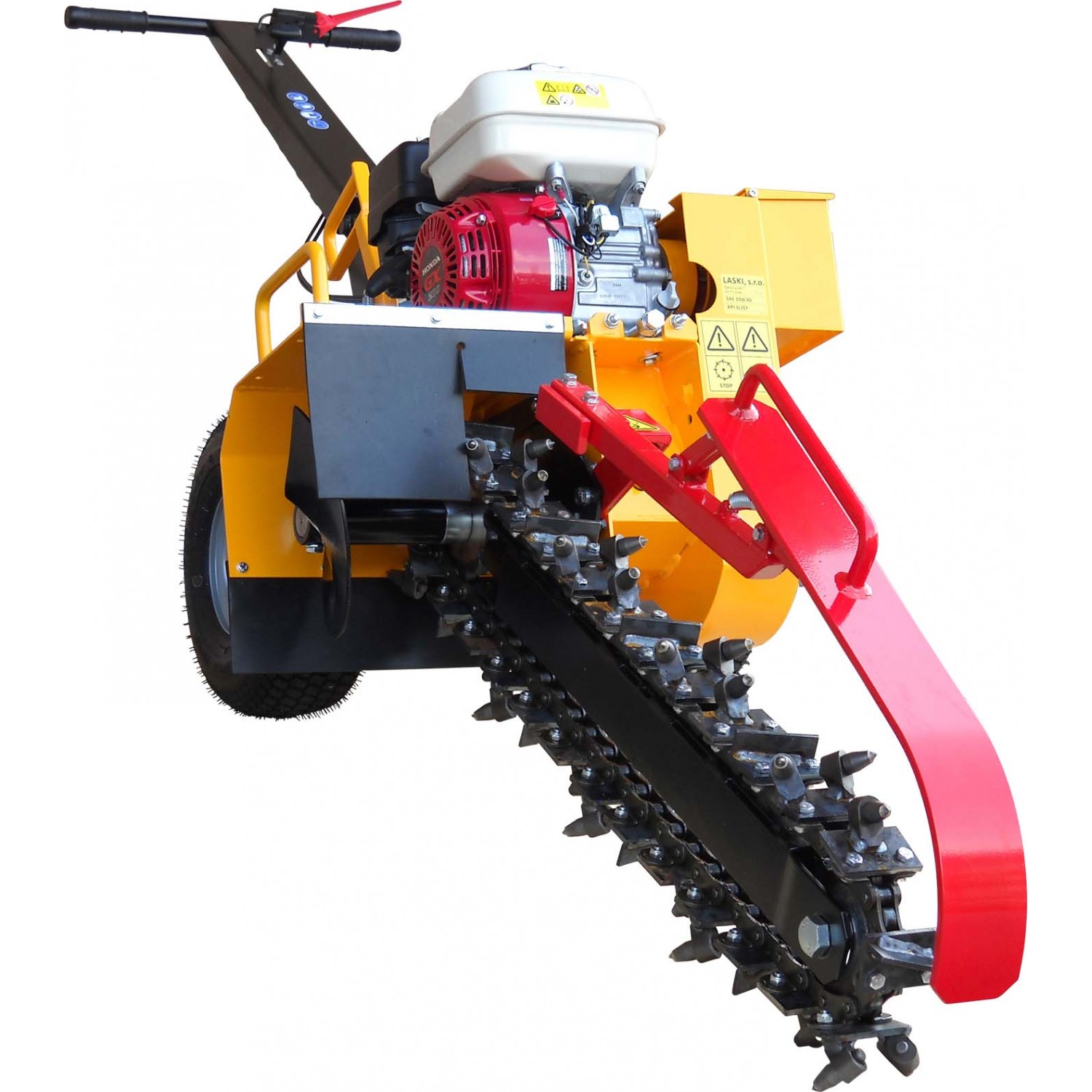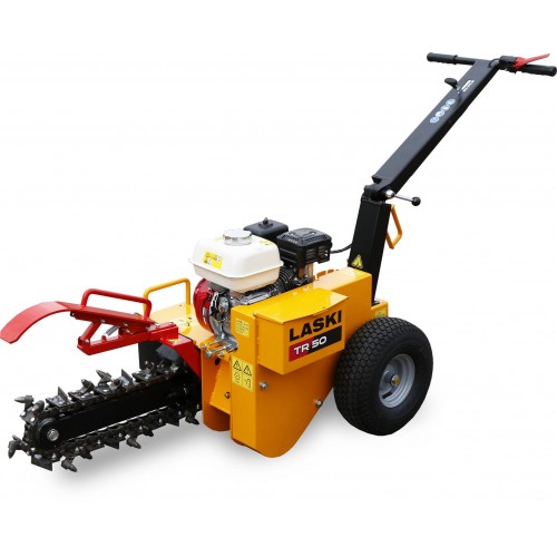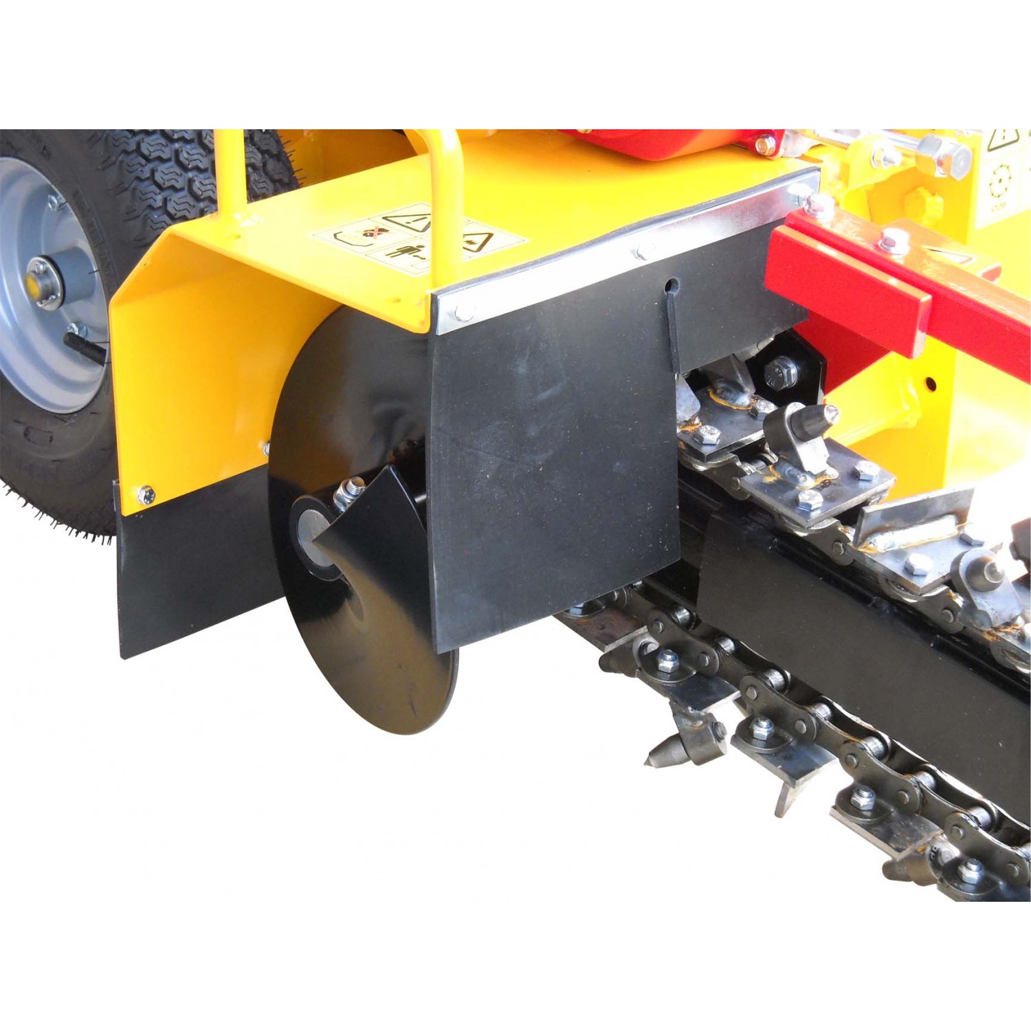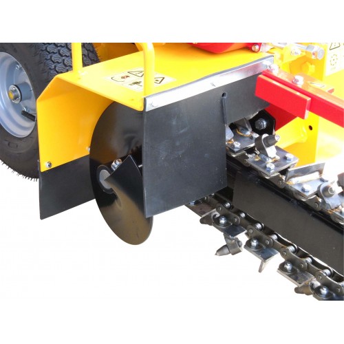 Si opera tirando la macchina indietro dopo che ha effettuato una prima parte di scavo. Profondita' di scavo da mm. 150 a 550, larghezza scavo mm. 100, velocita' massima scavo m. 40-60/ora, frizione centrifuga, picchi al carburo di tungsteno, coclea spostamento terreno di risulta, sensore olio ed interruttore di sicurezza, vibrazioni m/s2 4,5, rumorosita' dB(Lwag) 105, distanza dal centro della catena di scavo al bordo esterno della catenaria Dx/Sx mm. 222/498
