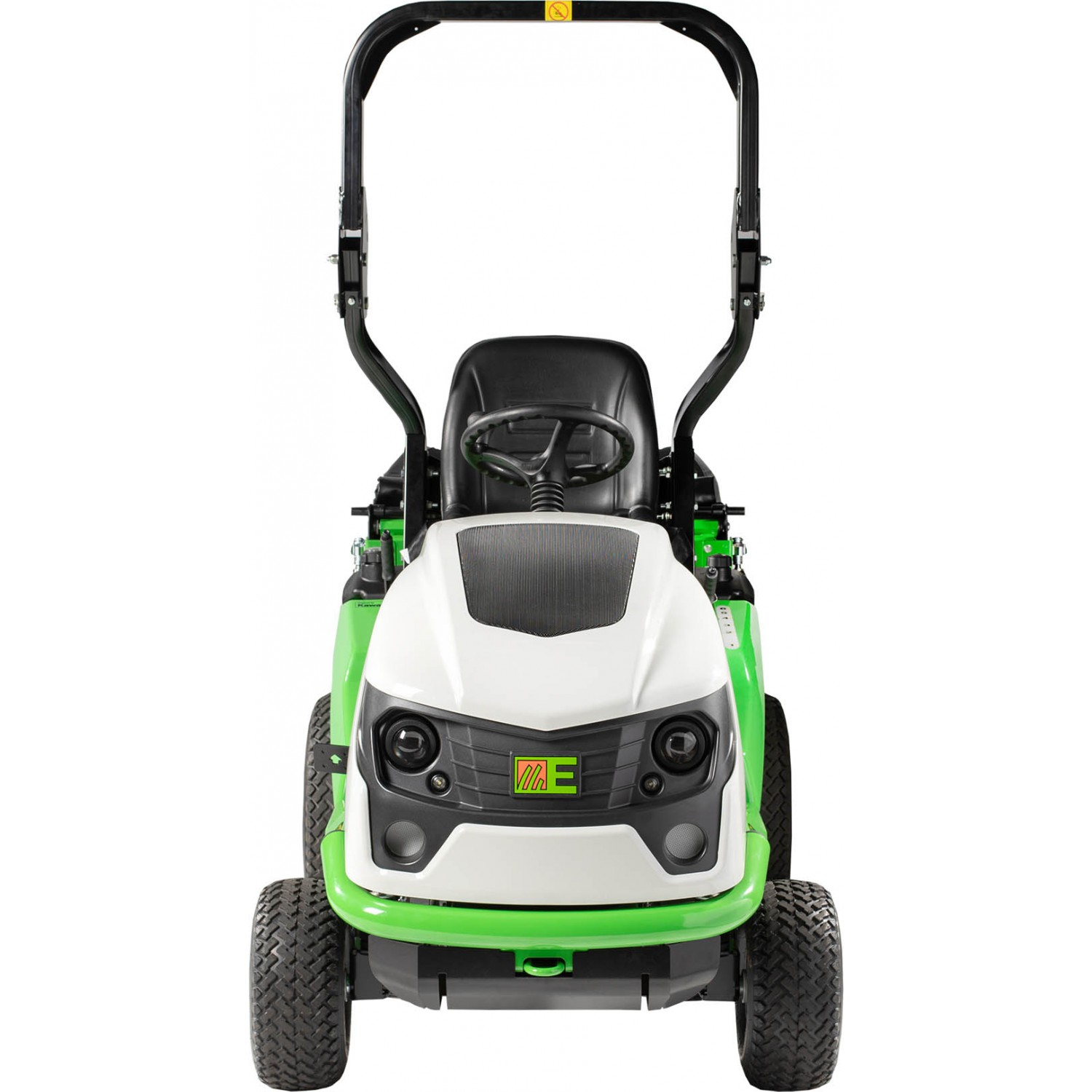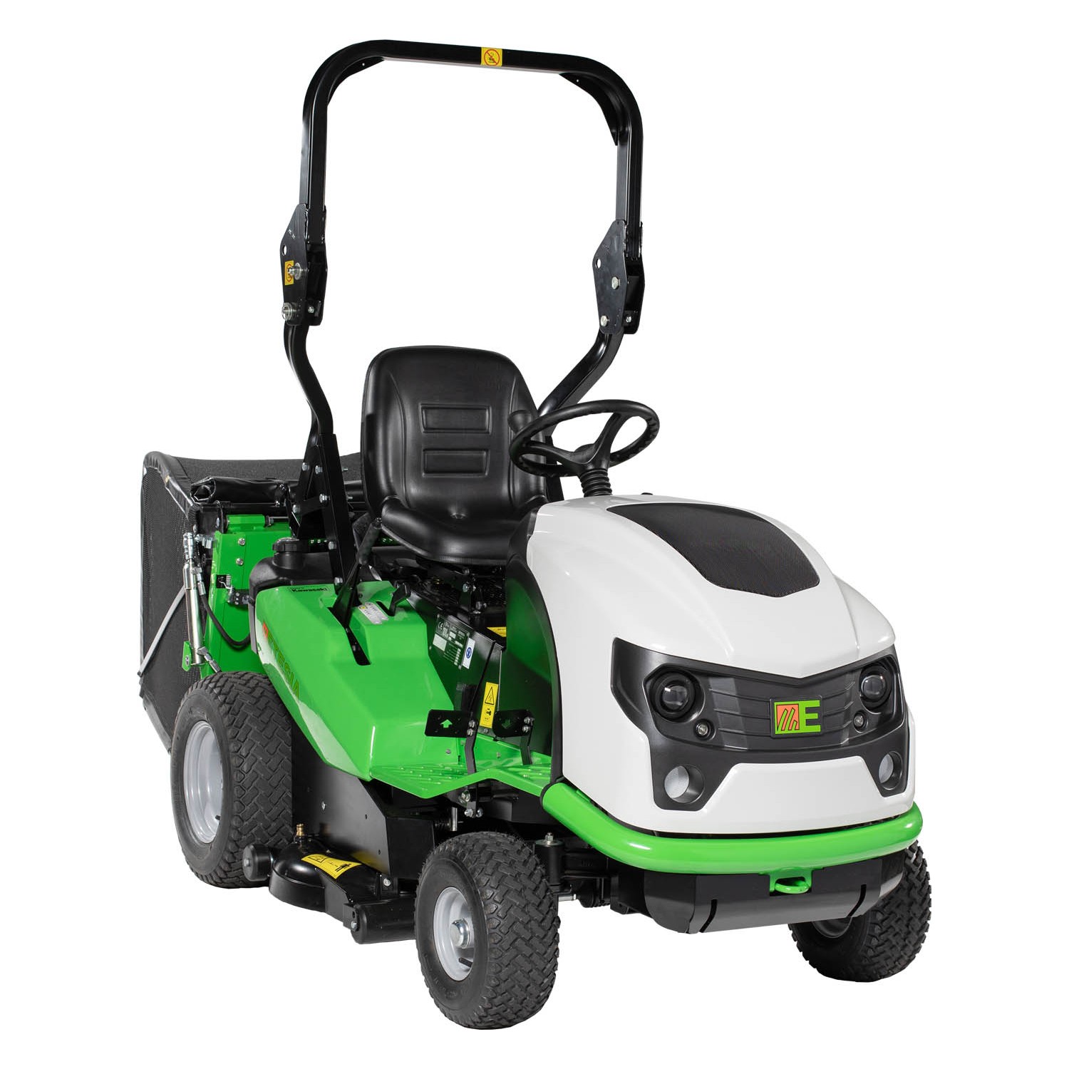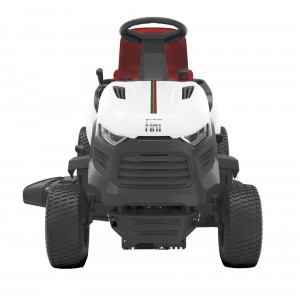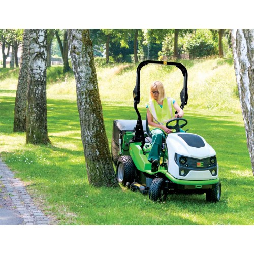 Motore Kawasaki FS541V due cilindri cc. 603, Kw. 11,2, Kgm. 3,91, raffreddamento ad aria, trasmissione idrostatica con rinvio a catena alle ruote posteriori, differenziale bloccabile al 100%, velocita' Km/h da 0 a 11 avanti e Km/h da 0 a 8 retro, telaio tubolare in acciaio saldato, freni idrostatico e a disco per parcheggio sulle ruote posteriori, piatto di taglio sospeso in pressofusione di alluminio spessore mm. 10 a scarico centrale, 4 rulli antiscalp, taglio mm. 1000, due lame controrotanti con sovrapposizione del taglio di mm. 40, innesto lame elettromagnetico con freno per arresto rapido, trasmissione da motore a lame tramite cinghia dentata, sicurezza lame con viti a rottura calibrata, regolazione altezza di taglio manuale su 6 posizioni da mm. 44 a 102, cesto di raccolta da l. 500 con telaio in acciaio tubolare e tela anti UV scaricabile idraulicamente a terra, sistema di sicurezze attive su sedile e cesto di raccolta, sedile regolabile, fari anteriori, rumorosita', dB(LwA) 88.