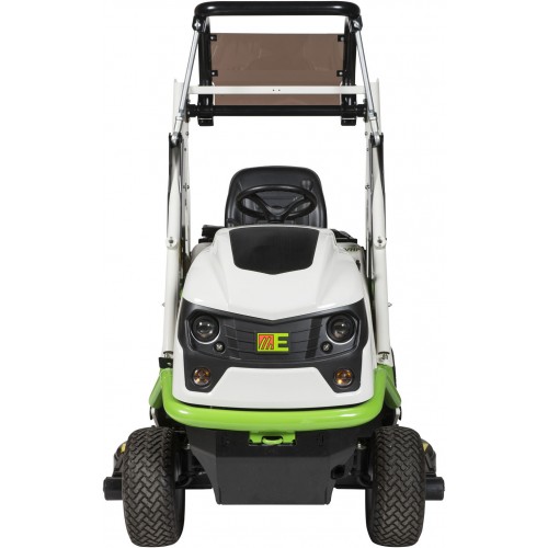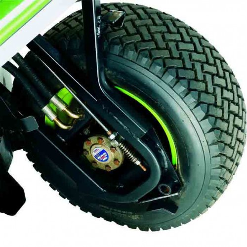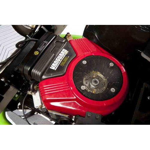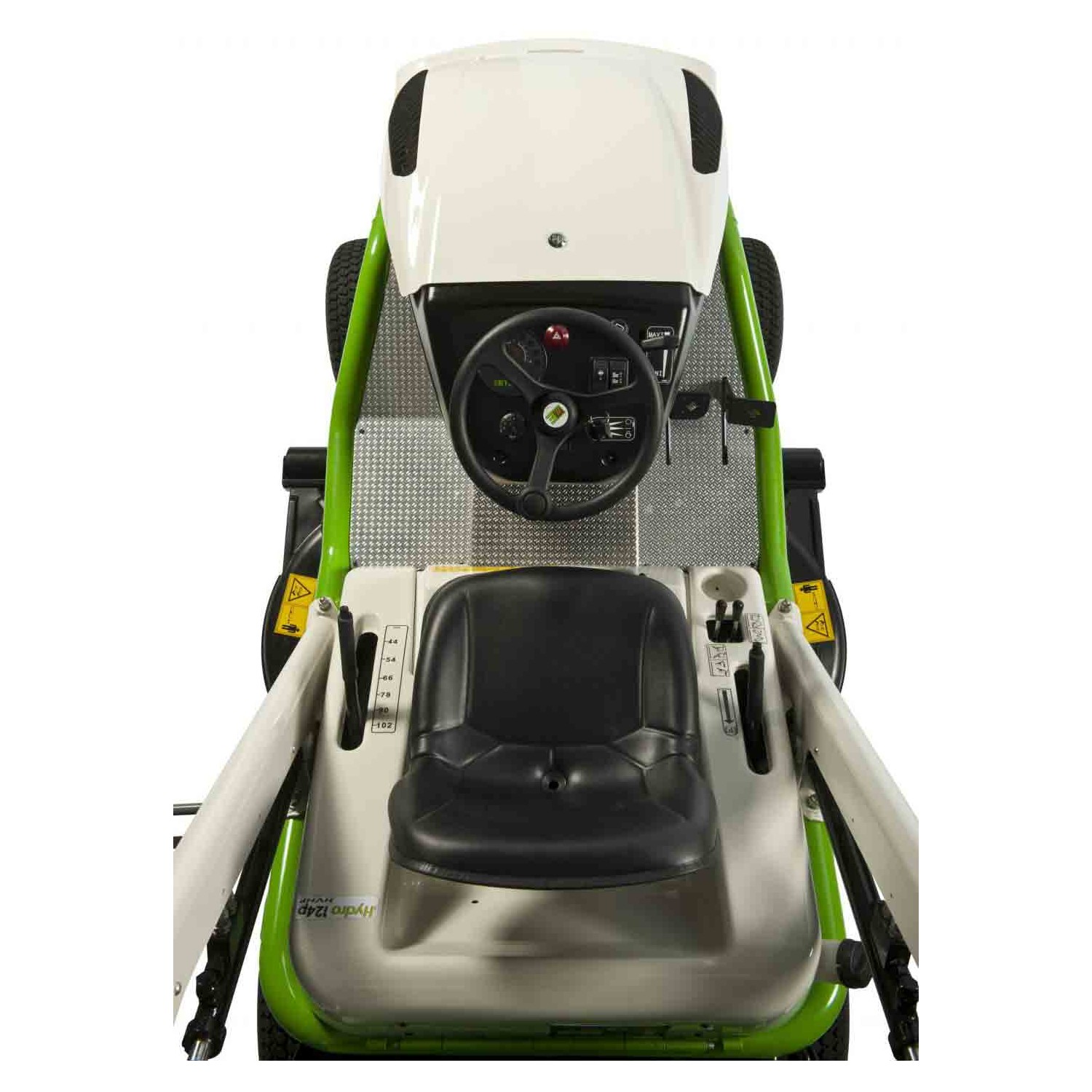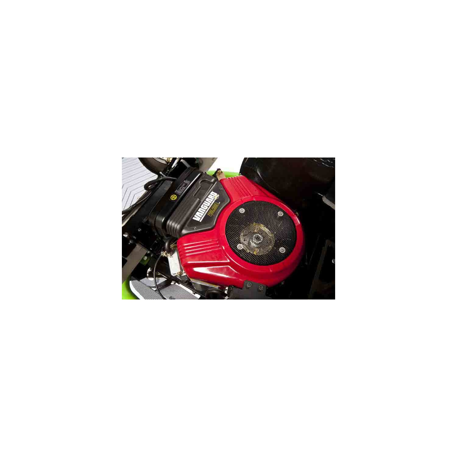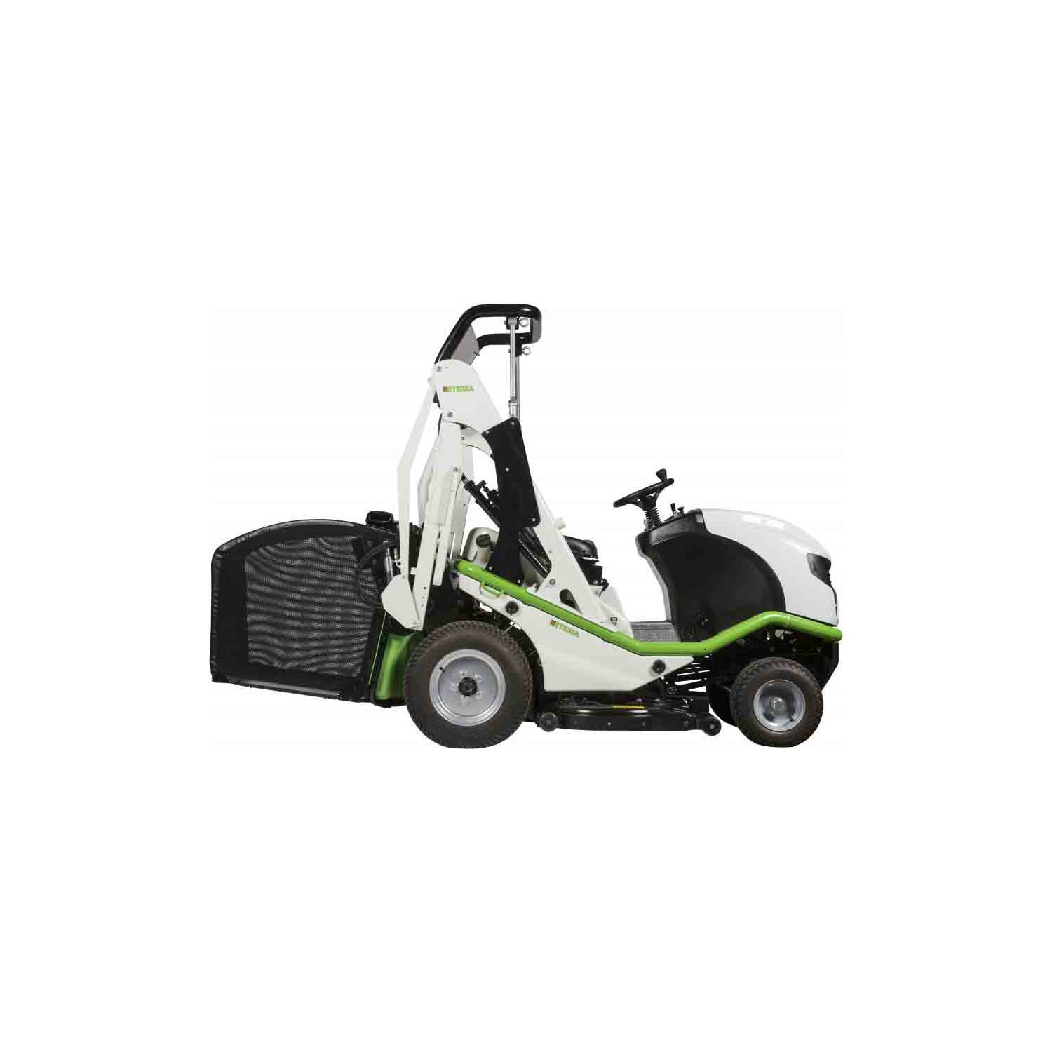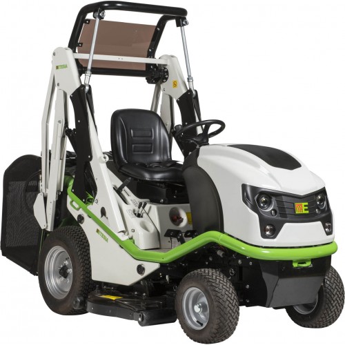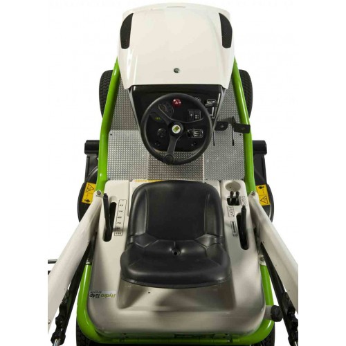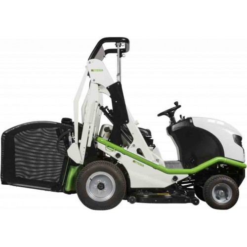 Motore BRIGGS & STRATTON Vanguard due cilindri cc. 627, Kw. 14, Kgm. 4,5, raffreddamento ad aria, trasmissione idraulica posteriore con bloccaggio dello slittamento, un motore per ciascuna ruota posteriore senza assale, velocita' Km/h da 0 a 12 avanti e retro, telaio tubolare in acciaio saldato, servosterzo idraulico, freni idrostatico e a tamburo per parcheggio sulle ruote posteriori, piatto di taglio sospeso in Mastershock a scarico centrale, 4 ruote antiscalp, due lame controrotanti con sovrapposizione del taglio di mm. 60, innesto lame elettromagnetico con freno per arresto rapido,trasmissione da motore a lame tramite cinghia dentata trapezoidale, sicurezza lame con viti a rottura calibrata, regolazione altezza di taglio manuale su 6 posizioni da mm. 44 a 102, cesto di raccolta posteriore da l. 600 in acciaio tubolare e tela anti UV sollevabile e scaricabile idraulicamente a m. 1,80, sistema di sicurezza attivo su sedile e cesto di raccolta, rumorosita' dB(LwA) 105 e 90 posto guida